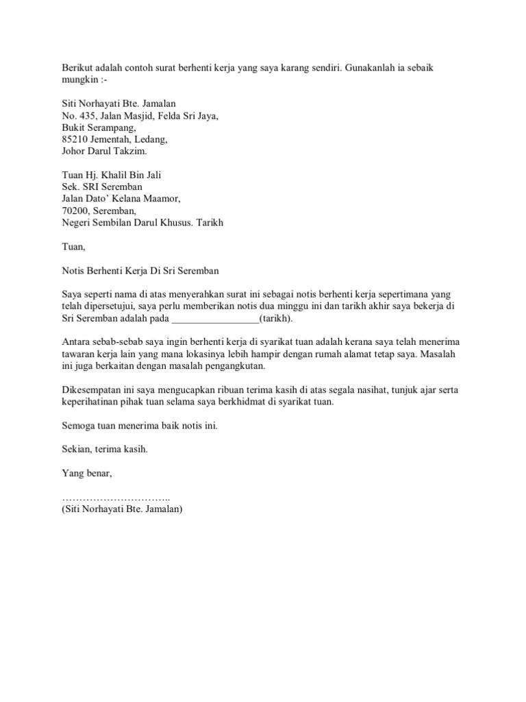 Saya ______ bekerja di bahagian. Samada notis 24 jam seminggu 2 minggu sebulan, semak contoh surat rasmi berhenti kerja / resign / perletakan jawatan bahasa melayu . Contoh surat berhenti kerja (resignation letter). Setiap pekerja selalumya perlu memberi notis berhenti 1 bulan lebih awal . Notis perletakan jawatan di (nama syarikat)dengan segala hormatnya perkara di atas adalah dirujuk. Walaupun majikan ada hak untuk 'waive' notis, akan tetapi majikan perlu membayar gaji untuk dua bulan notis tersebut kerana kontrak pekerja hanyalah tamat . Surat berhenti kerja anda akan memudahkan peralihan selama dua minggu akan. Surat berhenti kerja adalah surat pemberitahuan kepada hr atau majikan sekiranya mereka ingin meletak jawatan daripada pekerjaan mereka . Surat perletakan jawatan notis 24 jam & sebulan dalam bahasa melayu/ english bm bi. Takkan nak tulis surat berhenti kerja pun susah? Notis yang diberikan adalah bergantung kepada syarat pekerjaan terdahulu samada 24 jam, notis seminggu atau notis sebulan/ 2 bulan/ 3 bulan. Berikut ialah contoh surat berhenti kerja kerana telah mendapat tawaran di tempat lain, dengan notis 2 bulan. Secara amnya, notis berhenti kerja adalah dalam masa satu atau dua bulan.